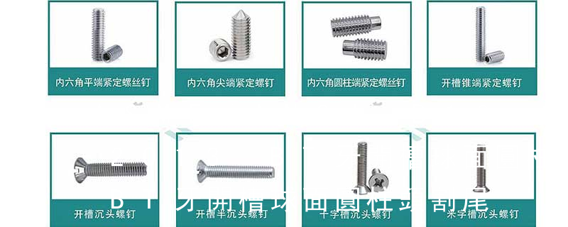 1、Flat:平頭 (鎖入后,頂部與工作件齊平)2、Oval:色拉頭、O頭、半沉頭 3、Round:圓頭 4、Pan:圓扁頭 5、Truss:大圓扁頭 6、Hex:六角頭 A-5:Finish Code/外觀處理。公制自攻螺絲 :于品名后方直接標示 Tapp 主要分類包括普通螺絲、機螺絲、自攻螺絲和膨脹螺絲三種。 有頭螺釘Cap screw 過去限于全牙的扣件。 六角頭螺釘Hex cap screw與大六角螺栓Hex bolt 顧名思義為頭部為六角型的外螺紋扣件,設計為使用扳手轉動。依照ASME B18.2.1標準,六