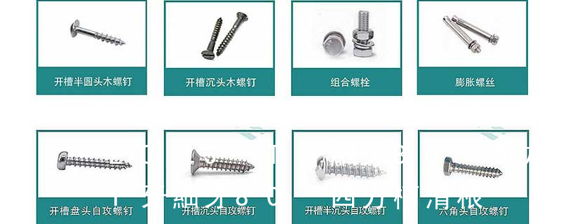 1.機螺釘 2.自攻螺釘 3.鉆尾螺釘 4.墻板釘 5.纖維板釘 6.木螺釘7.六角木螺釘 8.不脫出螺釘 9.組合螺釘 10.微型螺釘 11.家具螺釘 12.電子螺釘頭型:1.六角頭(hexagon head) 2.六角頭法蘭面(hexagon head with flange) 3.
